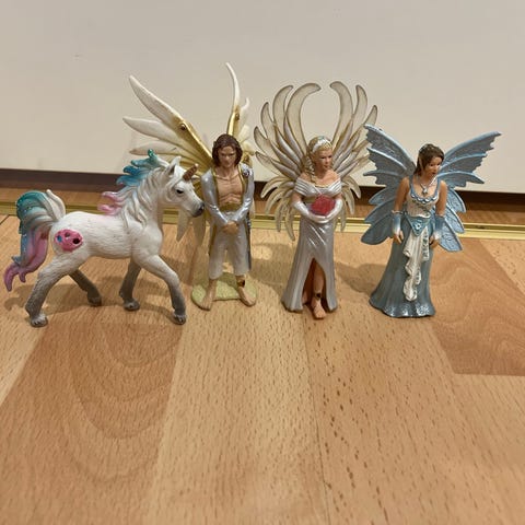 Lelukokoelma sisältää kaksi keijuhahmoa ja yhden hevosen. Keijuhahmot ovat vaaleanpunaisissa vaatteissa ja niillä on siivet. Hevonen on valkoinen, varustettu satulalla ja suitset. Lelut soveltuvat esinekeräilyyn tai lasten leikkeihin. Schleis merkki. Kulkeutuu tarv. Tampereen Kissanmaalle.