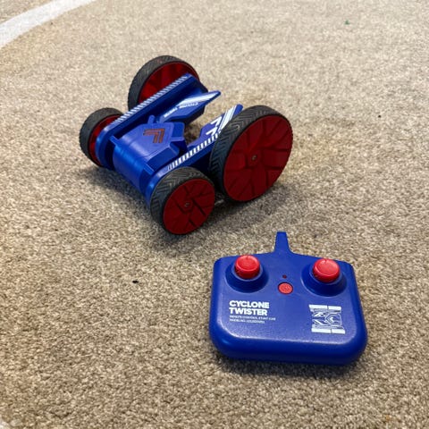 Kauko-ohjattava keltainen temppuauto. Autossa on valoefektit ja halutessasi myös musiikki. Voi ajaa molemminpuolisesti vähän vaikeammassakin maastossa ja lisänä temppunappula jossa pyörät "avautuvat" ja auto pyörii villisti paikoillaan. Tämä toiminto näyttää erityisen hyvälle pimeässä. Mukana käytännössä kaikki mitä paketista tuli. Usb piuha ladattavia paristoja varten autolle. Autossa siis sisällä yksi paristo ja yksi tulee "varalle". Kauko-ohjaimessa taitaa olla tavalliset patterit. Ei mitenkään älyttömästi tullut tällä meillä leikittyä mutta renkaiden väristä näkee että ainakin kerran on käyty pihallakin. Yleisesti ottaen ajokki on hyvässä leikityssä kunnossa.