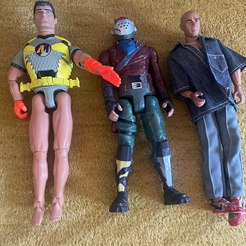 Action man -hahmo varusteineen. Action man on hukannut vaatteensa, tehty villaliivi ja - housut.