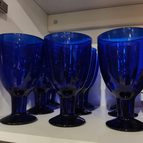 Neljä kappaletta iittalan verna sarjan koboltinsinisiä juomalaseja.