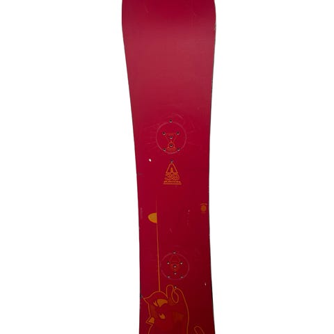 Vanha, kulunut ja naarmuinen/ kolhuinen Burton Cruzer- lumilauta Burton custom- siteillä ja unidisk keskiöillä.