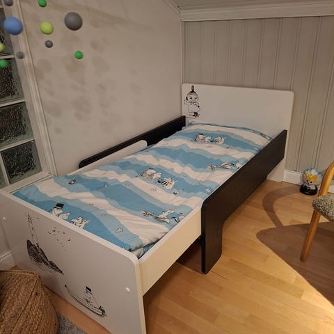 Maskusta ostettu Muumi-aiheinen jatkettava lasten sänky aluslaatikolla..