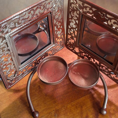 Kaunis teline. Kevyt. Noin 23x33x33 cm. Sopii moneksi. Keskikerros on kullanvärinen. Alimmassa näkyy minttua sävyä hyvin. Postitus (9e) tai haku. Kulkee metrolla keskustaan saakka.