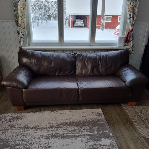 Elämää jo nähnyt. Ollut koira taloudessa, karvoja siis löytyy. Värjäytymiä tyynyissä, en ole koittanut pestä. Koira nakertanut sohvatyynyn alle pienen reijän, mutta ei näy käytössä. Pesu jää hakijalle.