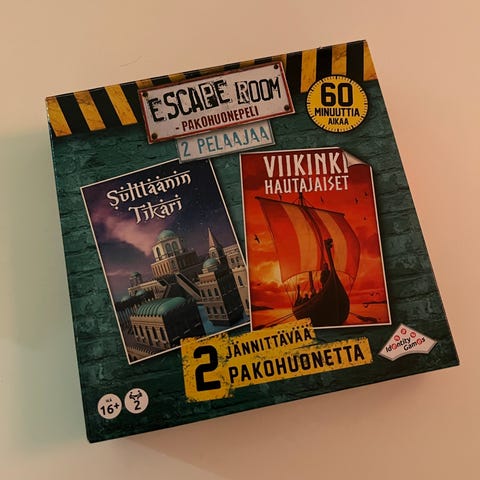 Kerran pelattu suomenkielinen pakohuonepeli. Pelattu niin ettei tuhottu/tehty merkintöjä eli uudenveroisessa kunnossa.