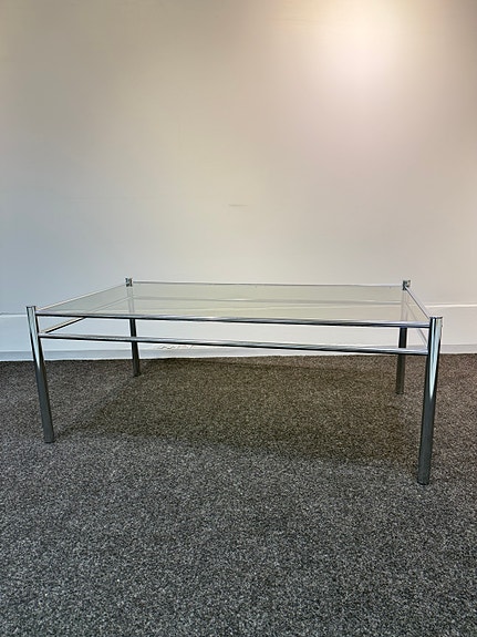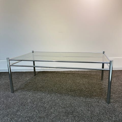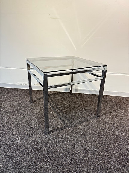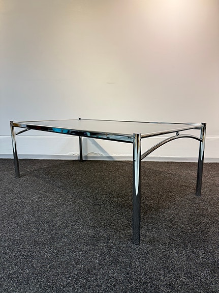 Todella hyväkuntoinen kromattu retro sohvapöytä tummalla lasikannella.