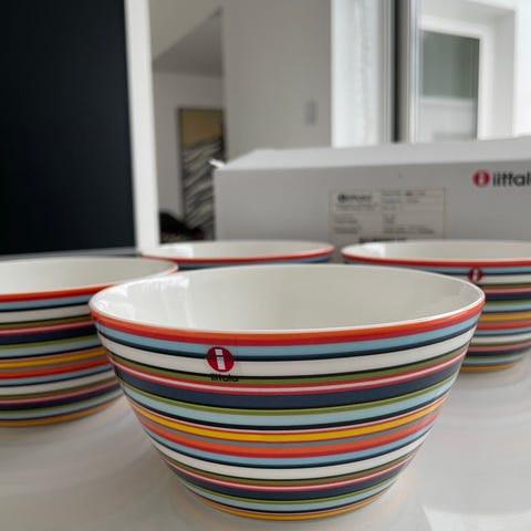 Iittalan Origo-sarjan tarjoilukulho, jossa on tunnusomainen monivärinen raitakuviointi.