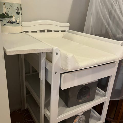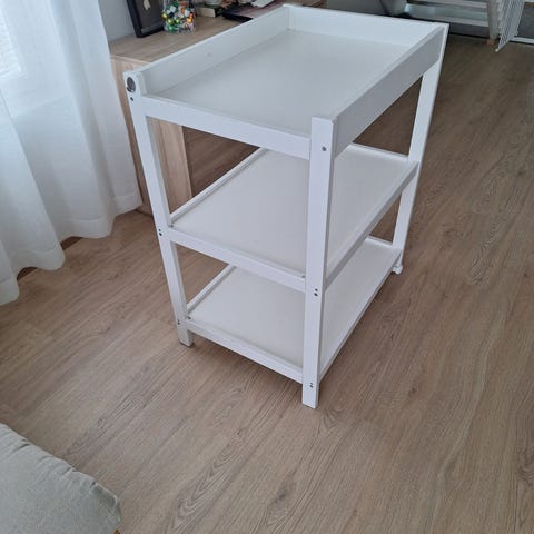 Valkoinen hoitopöytä, jossa myös runsaasti säilytystilaa. Irroitettava hoitotaso. Hyvässä kunnossa.