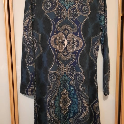 Kirjava mekko, koko 38, vuori. Nouto Paciuksenkadulta, käteinen.