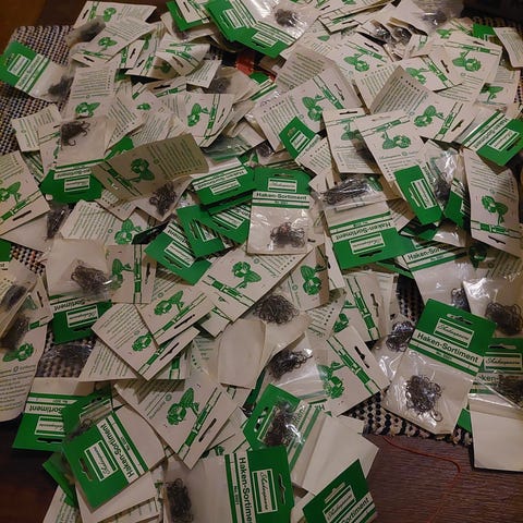 Muovipakki, jossa vanhempaa pystypilkkiä, uistinta, koukkuja ym. Osa ruosteessa.