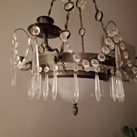Vanha kristallikruunu. Joitakin irto-osia saattaa puuttua, mutta ei osunut silmiini muuta kuin keskellä oleva pallo. Se on tallella, mutta kiinnitys on pettänyt. Sähköistystä saattaa joutua uusimaan.