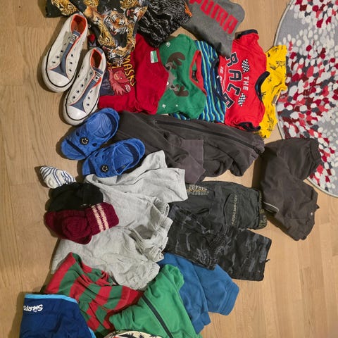 Käytössä olleita vaatteita. Osa käyttämättömiä ja osa enemmän Käytössä olleita että vähän värit haalistuneet.sininen kevyt takki käyttämätön ja kokoa 116.musta fleecevuorellinen pipo.mustat softshell waterproof kengät kokoa 29.