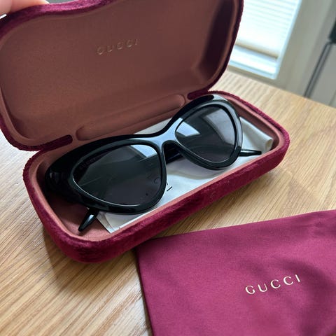 Gucci gg2432 aurinkolasit. Kehykset ovat ruskeat ja linssit sävyltään ruskeat. Mukana tulee Gucci-merkkinen suojakotelo. Lasien leveys on noin 15 cm ja sangan pituun noin 13 cm.