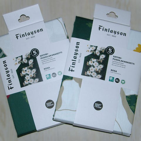 Tämä setti ostettu lahjaksi, mutta ei päätynytkään lahjaksi. Itselläni on vastaavia Finlaysonin lakanoita käytössä, ja nämä ovat ihanan sileät, pehmeät ja hohtavat. Lankaluku on 228TC, eli tavallista tiheämmin kudottu (sopii erityisen hyvin allergikoille, kun pöly ei tartu herkästi).