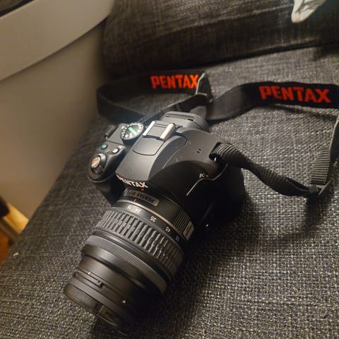 Digitaalinen järjestelmäkamera Pentax K-x, 18-55 mm objektiivilla. Toimii 4 x AA pattereilla (kannattaa käyttää ladattavia pattereita).