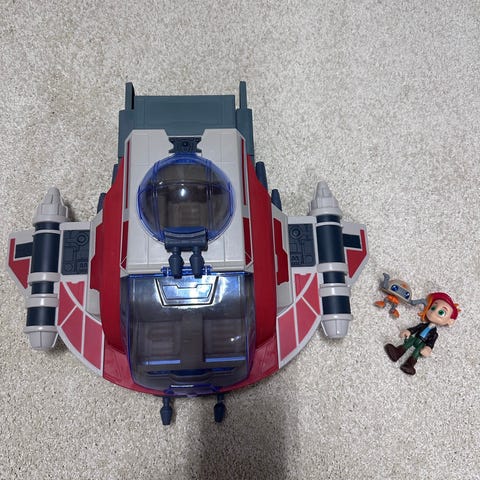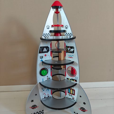 avaruusalus lelu, muovinen, valkoinen ja harmaa väri, sisältää punaisia yksityiskohtia. Leikkikokoonpano, avattava ohjaamo ja takana tilaa säilytykselle tai lisäosille. Soveltuu lasten leikkeihin.