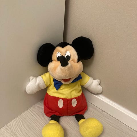 Mikki Hiiri pehmolelu, jossa punainen paita ja housut. Pehmolelu on valmistettu pehmeästä materiaalista ja esittää suosittua piirroshahmoa.