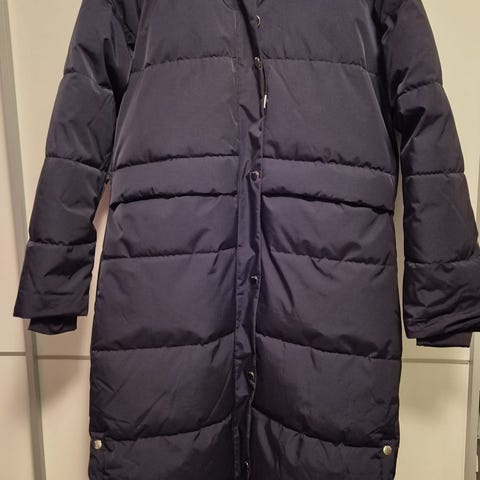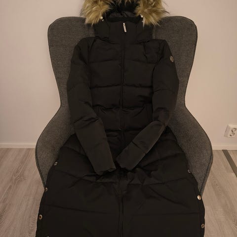 Pitkämalli, sivuissa nepparit ja halkiot. Irrotettava huppu. Taskut.