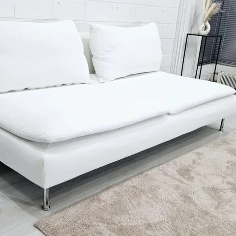 Sohva on hyvä kuntoinen. Päälliset juuri pesty. Päälliset ovat irrotettavat runko myöden. Mitat Leveys 189cm, syvyys 98cm. Väri Finnsta valkoinen.