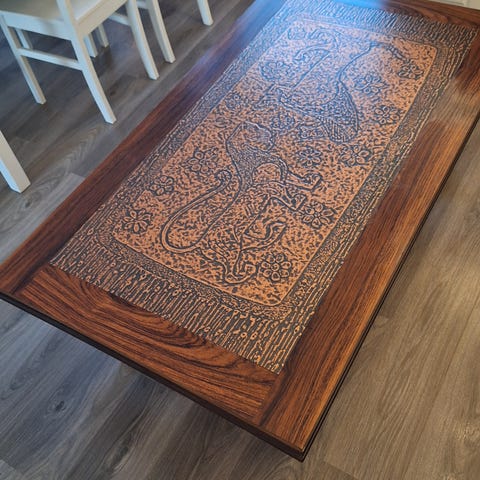 Pohjamaalattu, kokopuusta tehty, eli vankka hyväkuntoinen pöytä.