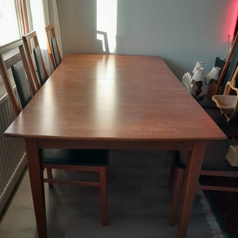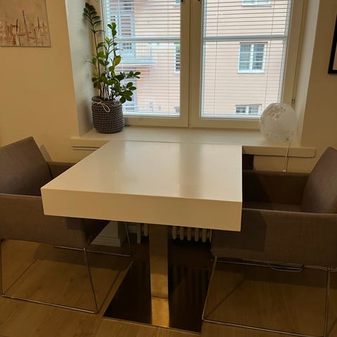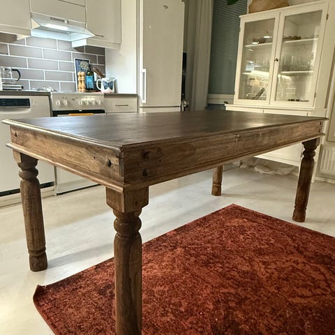 Puinen ruokapöytä kultaisenvärisellä painavalla jalalla. Muutamia pieniä naarmuja pinnassa, lähtee varmasti hiomalla. Nouto Tapiolasta!