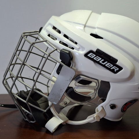 Lasten Bauer jääkiekkokypärä valkoisena. Kypärä on suunniteltu jääkiekkokäyttöön ja siinä on säädettävä kokorakenne sekä leukahihna. Koosta en ole varma. Meidän 5 vuotiaalle tämä oli sopiva.