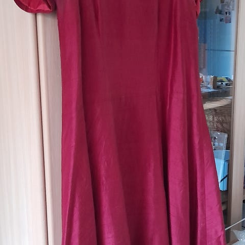 Aivan upea! Karkkipastelliruutuinen. Karkkimaiset napitkin. Pussimainen yläosa, tiukempi alaosa. Joko nostettuna ylemmäs tai sitten pitää pidempänä lantion kohdalla. Ei merkintöjä, mutta luultavasti raakasilkkiä/thaisilkkiä, eli vähän paksumpaa, muttei paksu. Pinta mattakiiltävä. Menee kokoon XL asti, malli sopii monelle koolle! Kaulukset ja olalla tampit. Kovikekankaan kohdista vähän rypistynyt, muutamista koristelaskoksista ompeleet auenneet, mutta yleisilme siis tosi hyvä, suorastaan upea!