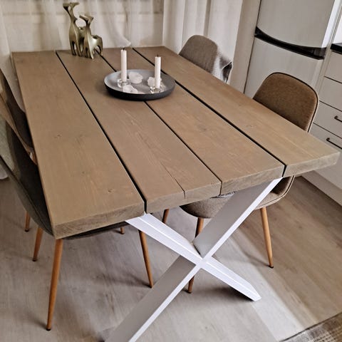 Hakusanat: lankkupöytä, rustiikkinen, petsattu, ruokapöytä, puupöytä, puinen pöytä, ruokaryhmä, ruokailuryhmä, pöytä, keittiö, keittiön pöytä, keittiöpöytä, Lana, Veke, tuoli, keittiötuoli, puinen tuoli, valkoinen tuoli