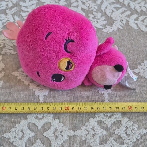 Sininen pehmolelu lintu, jossa on vaaleanpunaiset siivet, valkoinen vatsa ja siniset höyhenet päässä. Pehmolelu on pieni ja sopii lasten leikkeihin tai keräilyyn.