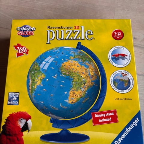 Ravensburger Puzzleball Maapallo palapeli, jossa on 540 palaa. Palapelin koko n. 23 cm, ja se muodostaa kolmiulotteisen maapallon.