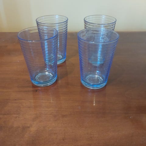 Värilliset muoviset juomalasit. Viinilaseista käytetty sinistä ja punaista kerran. Muut käyttämättömiä. Materiaali muovi. Vain nouto