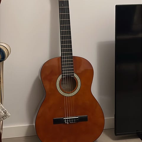 Kitara on ollut pienten lasten käytössä ja siinä on lukuisia kolhuja. Kitarassa ei ole halkeamia tms ja se on täysin käyttökunnossa. Kitaraan on asennettu olkahihna minkä saa mukaan. Mukaan myös kitaraan sopiva kantopussi ilman olkahihnoja.