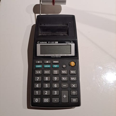Vintage nauhalaskin vuodelta 1987. Toimii sekä paristolla, että verkkovirralla. Mukaan 2 täyttä laskunauharullaa ja kolmannestakaan ei montaa metriä puutu. Ainoa miinus, että väritela on kuivunut, mutta uusia näyttää vielä löytyvän konttoritarvikeliikkeistä. Tätä ei ole paria kertaa enempää käytetty ja on säilytetty omassa laatikossaan. Käyttöohjekin suomeksi tulee mukana.