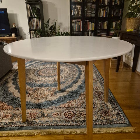 Myydään Jysk jegind ruokapöytä. Pöydässä pieni jälki/tahra jota ei oli yritetty poistaa paremmilla aineilla. Lisäksi pöydän reunassa pieni kolhu, nämä näkyvissä kuvissa. Jalat irroitettu kuljetusta varten. Nouto Espoon Tontunmäestä.