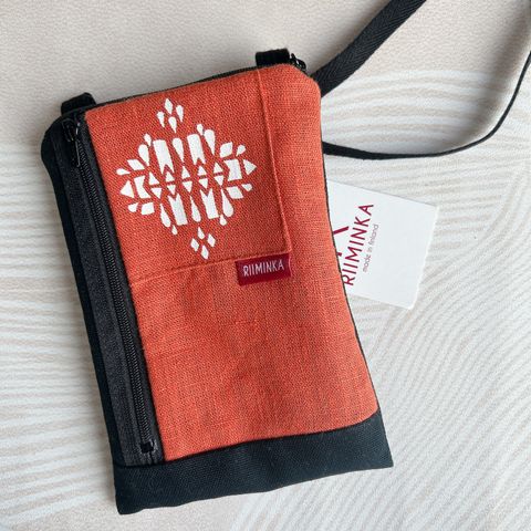 Riiminka kännykkäpussi/ laukku. Säädettävä olkahihna. Ei kovin suurelle kännykälle. Sisään mahtuu esim. Iphone 13 kokoinen puhelin, mutta vetoketju ei mene kiinni.