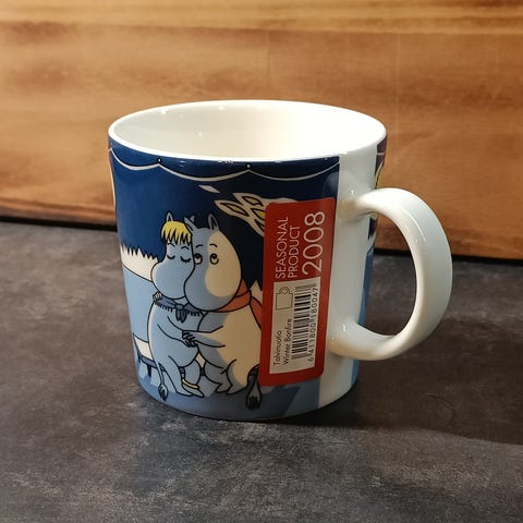 Käyttämätön ja tarrallinen muumimuki, delfiinisukellus 2007.