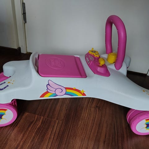 Erinomaisesti liikkuva potkuauto, pyörät kääntyvät eri suuntiin ja pääsee ajamaan myös sivuttain. Käytetty kunto, mutta toimiva ja ehjä. Osa tarroista puuttuu. Istuinosassa avattava luukku ja säilytystilaa. Lisäksi etuosassa töötti.