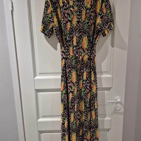 Kauniisti laskeutuva kangas, helmassa kaksi kerrosta, edessä kangasnapit samasta kankaasta kuin mekko, vyötärölle sopii hienosti esim. leveämpi vyö.