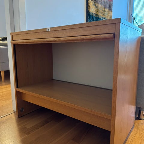 Yläosassa vetolaatikko ja siirrettävä lasihylly, alaosassa vankka puutaso.