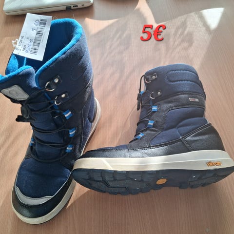 Parina talvena käytössä olleet talvikengät. Molemmista nauhat poikki. Liat lähtenevät pesemällä.
