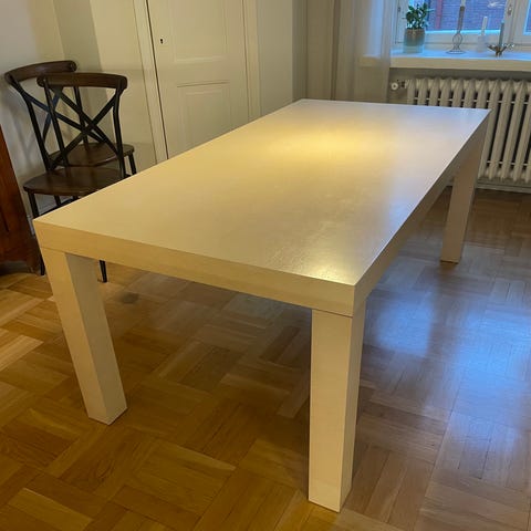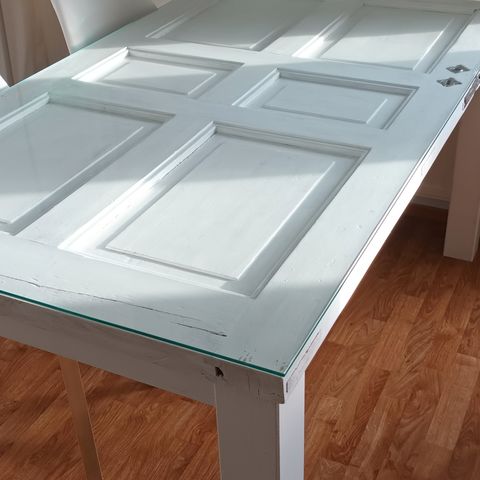 Vanha ovi, josta on kunnostettu ruokapöytä. Kaipaa maalia ja lasia puuosan päälle. Mustat pukkijalat. Mitat: pituus 190cm, leveys 105,5cm, korkeus 68cm. Vain nouto.