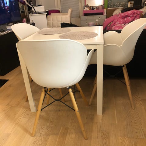 Pöytä ja tuolit ovat valkoiset, väri on täysin kunnossa eikä ole kulunut.