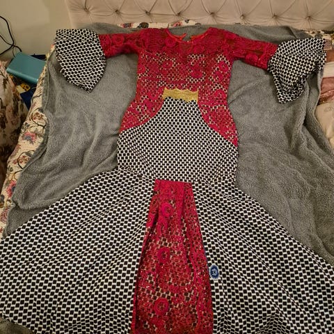 Ghanassa teetetty jo valmiiksi liian pieni juhlapuku. Yläosa kerman väristä pitsiä ja strasseja. Sinisessä alaosassa kumonauhavyötärö ja strasseja. Menee vaikka vähän erikoisempana vanhojentanssipukuna.