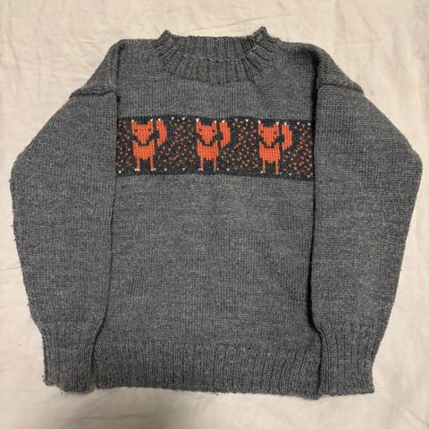 Lasten uudenveroinen / käyttämätön käsinneulottu vihreä / tummanharmaa / vaaleanharmaa / oranssi kettu kirjoneule.