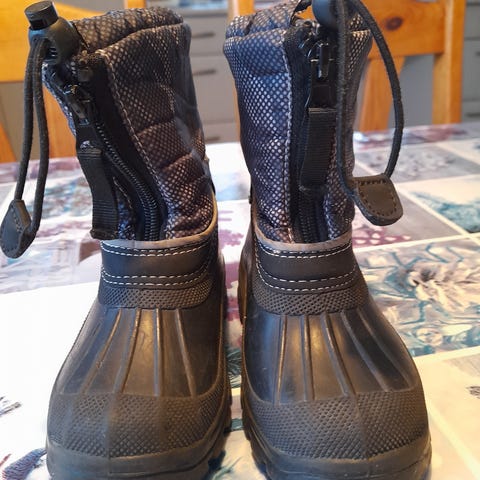 Ehjät lasten saappaat veroketjuvarrella. Yhdellä lapsella käytössä ”kaupunkikenkinä”. Pientä kulumaa kärjessä. Yleisilmeeltään siistit.