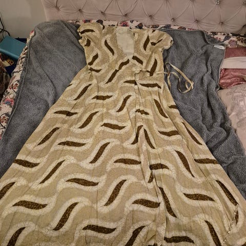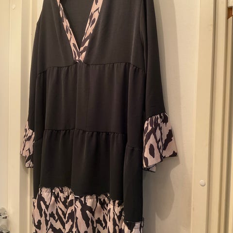 Ghanassa teetetty mekko. Paikallisen tavan mukaan mekkoon on ommellessa jätetty kankaan laadusta kertovat tarrat. Lähtee pesussa pois. Mennee 42 kokoiselle ja 44 kokoiselle, joka on pieni yläosastaan.