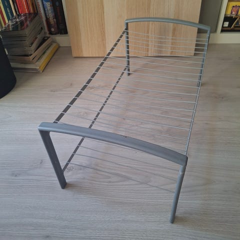 Hyväkuntoinen valkoinen puinen Uggerby-kenkähylly. Kasattavissa päällekkäin korkeammaksi hyllyksi.