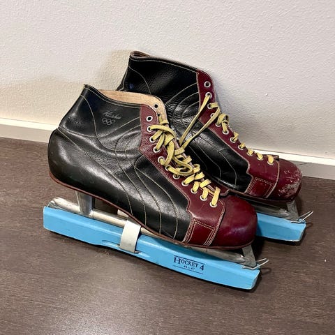 Ehjät vähän käytetty, näihin on ajettu terät muutamia vuosia sitten että voi mennä jäällekin. Ajattelisin että hyllynkoriste tai hokkarit naulaan vintage lahjaksi.