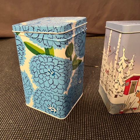 Marimekko säilytysrasia, valmistettu metallista. Väri punainen, koristeltu kultaisin yksityiskohdin. Sopii kahvipurkiksi.
