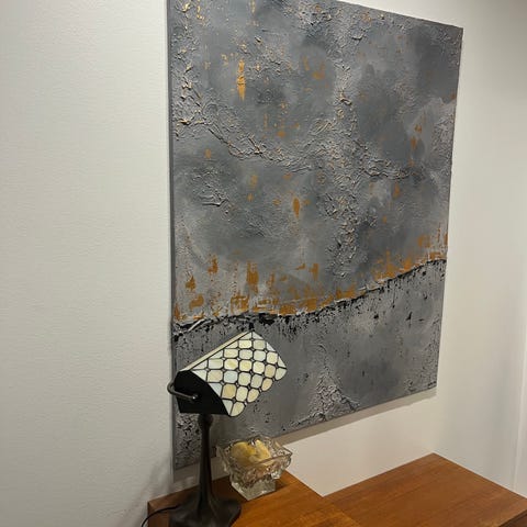 Abstrakti taulu, jossa harmaan ja kullan sävyjä. Taulun koko on 50x70 cm. Soveltuu seinäkoristeeksi erilaisiin tiloihin.